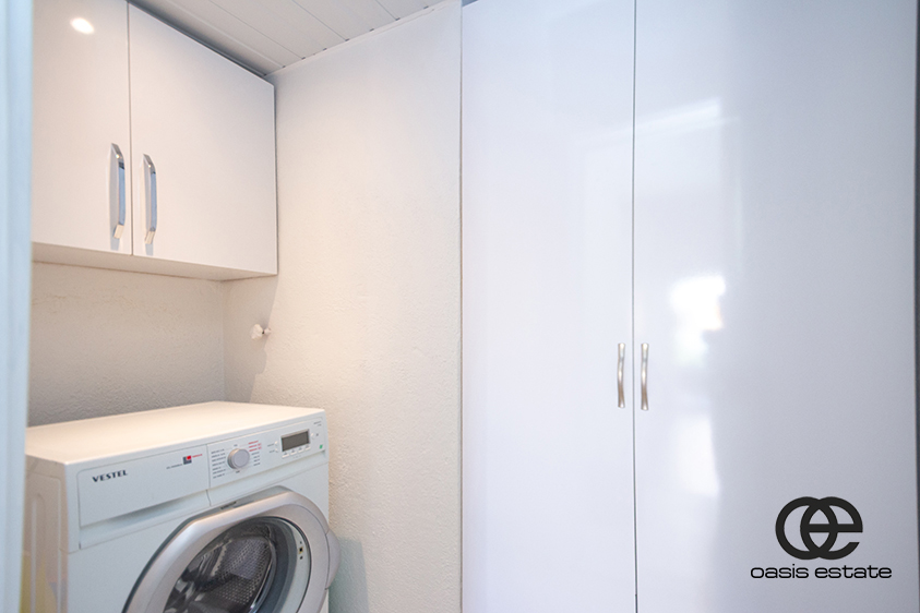 Der er også et separat bryggers med vaskemaskine og ekstra opbevaringsplads, hvilket gør det mere praktisk at bo her på lang sigt.