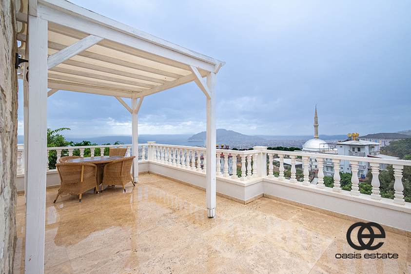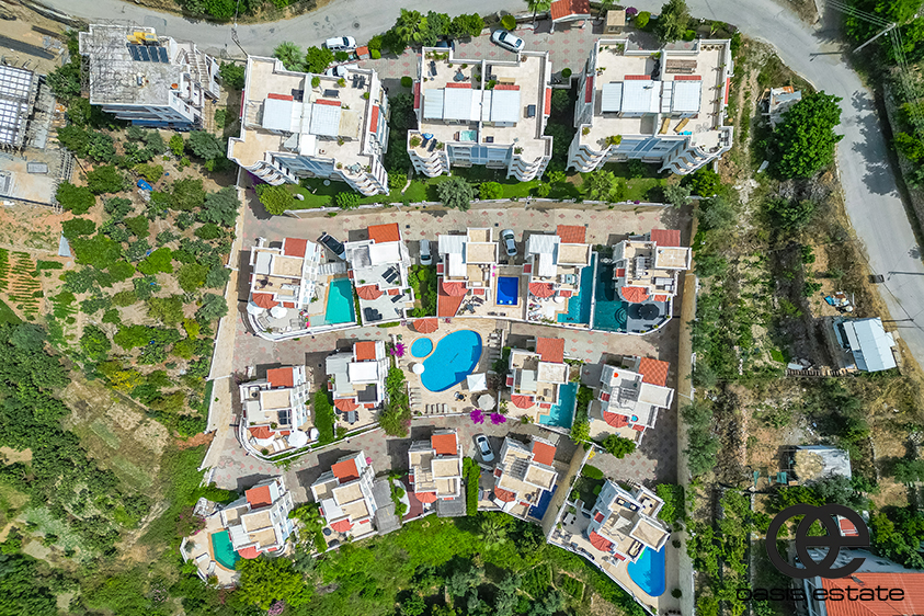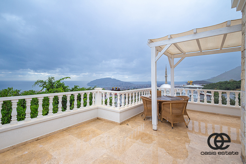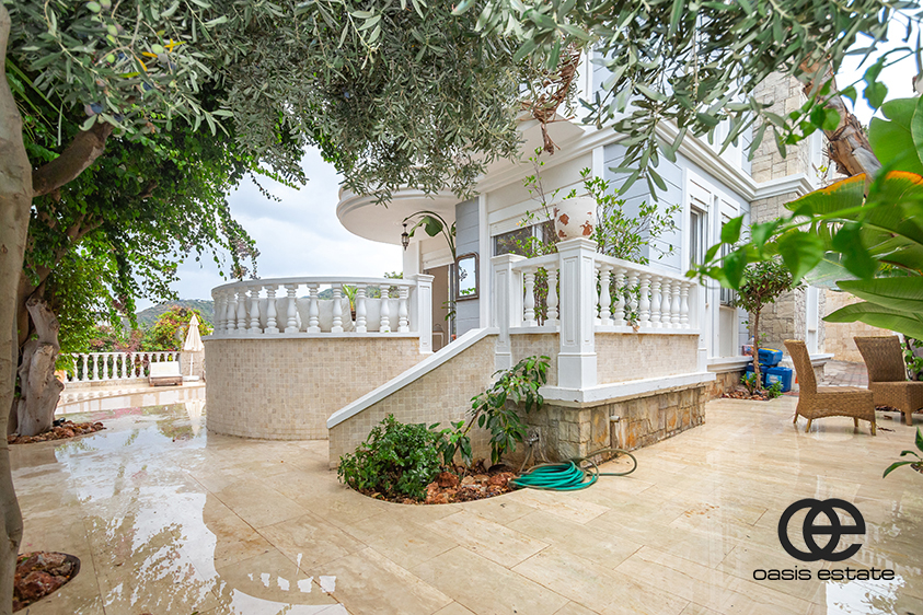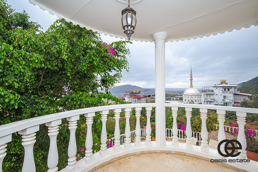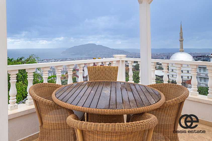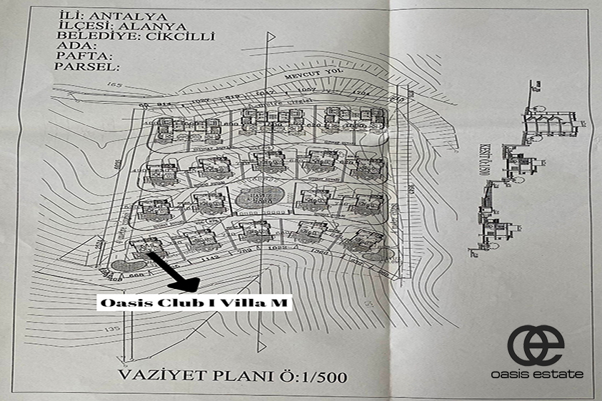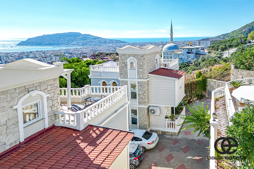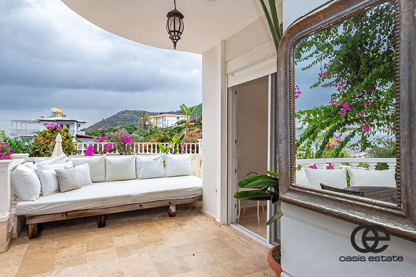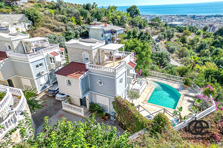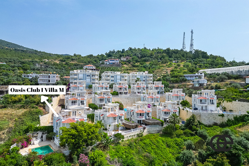 Denne villa ligger i det rolige og højtbeliggende område Cikcilli og nyder godt af en fredelig beliggenhed med panoramaudsigt over havet, slottet og byen. Ejendommen er en del af Oasis Club I-komplekset, et velholdt boligområde med 14 villaer og 3 lejlighedsblokke. Komplekset tilbyder en afslappet atmosfære i europæisk stil, ca. 10-15 minutter i bil fra havet og Alanya centrum.
