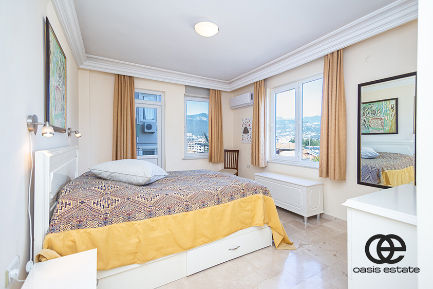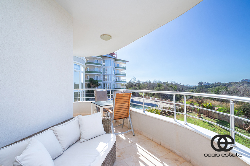 Lejligheden tilbyder smuk og åben udsigt, herunder havudsigt, udsigt til haven, udsigt til Alanya Slot og udsigt over kompleksets grund og swimmingpool, hvilket skaber et afslappende og naturskønt boligmiljø.